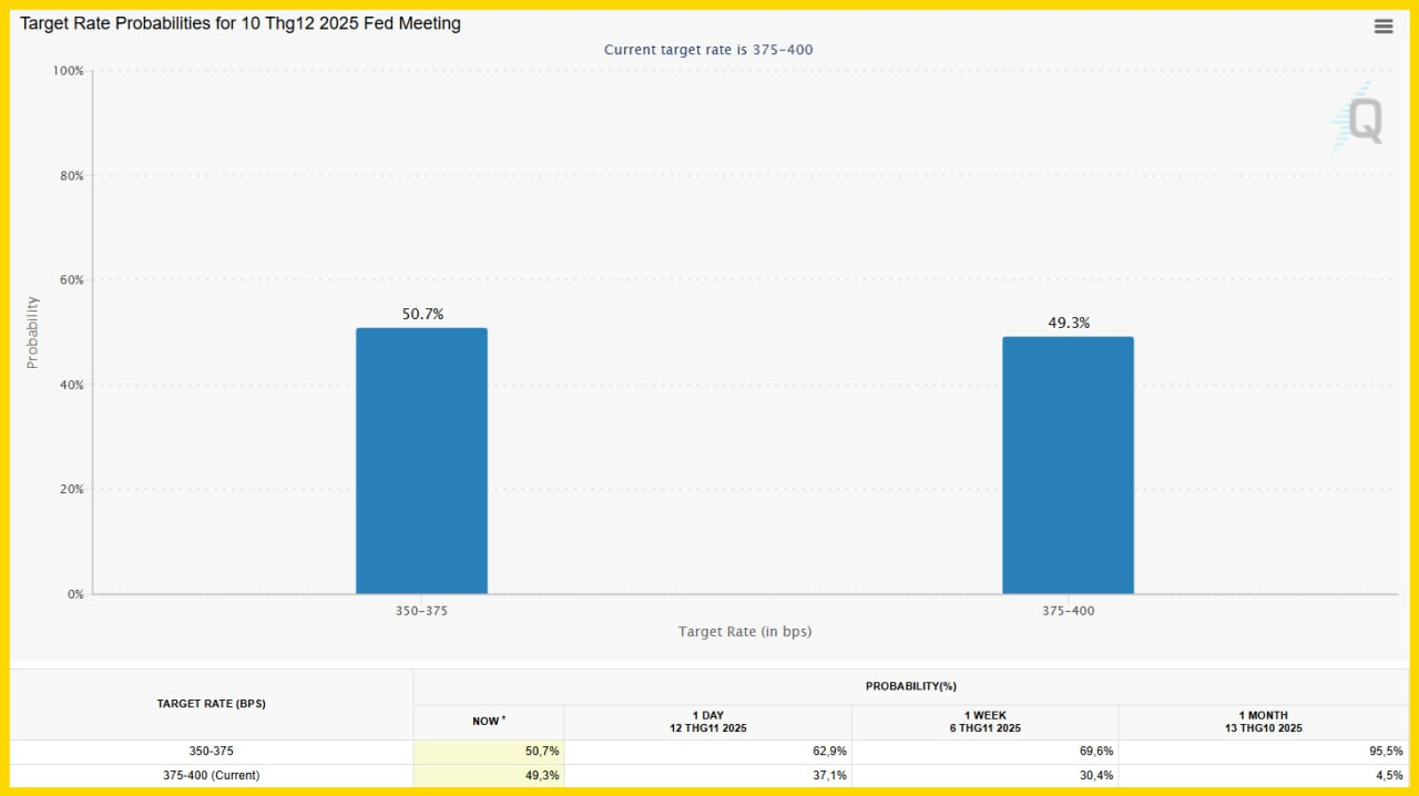 => FED đang phát tín hiệu "diều hâu" trở lại, không còn tỏ ra sẵn sàng nới lỏng như kỳ vọng thị trường. Tỷ lệ FED cắt lãi suất 0,25% trong tháng 12 trên CME đã rơi từ 62,9% xuống còn 50,7% chỉ sau 1 đêm.