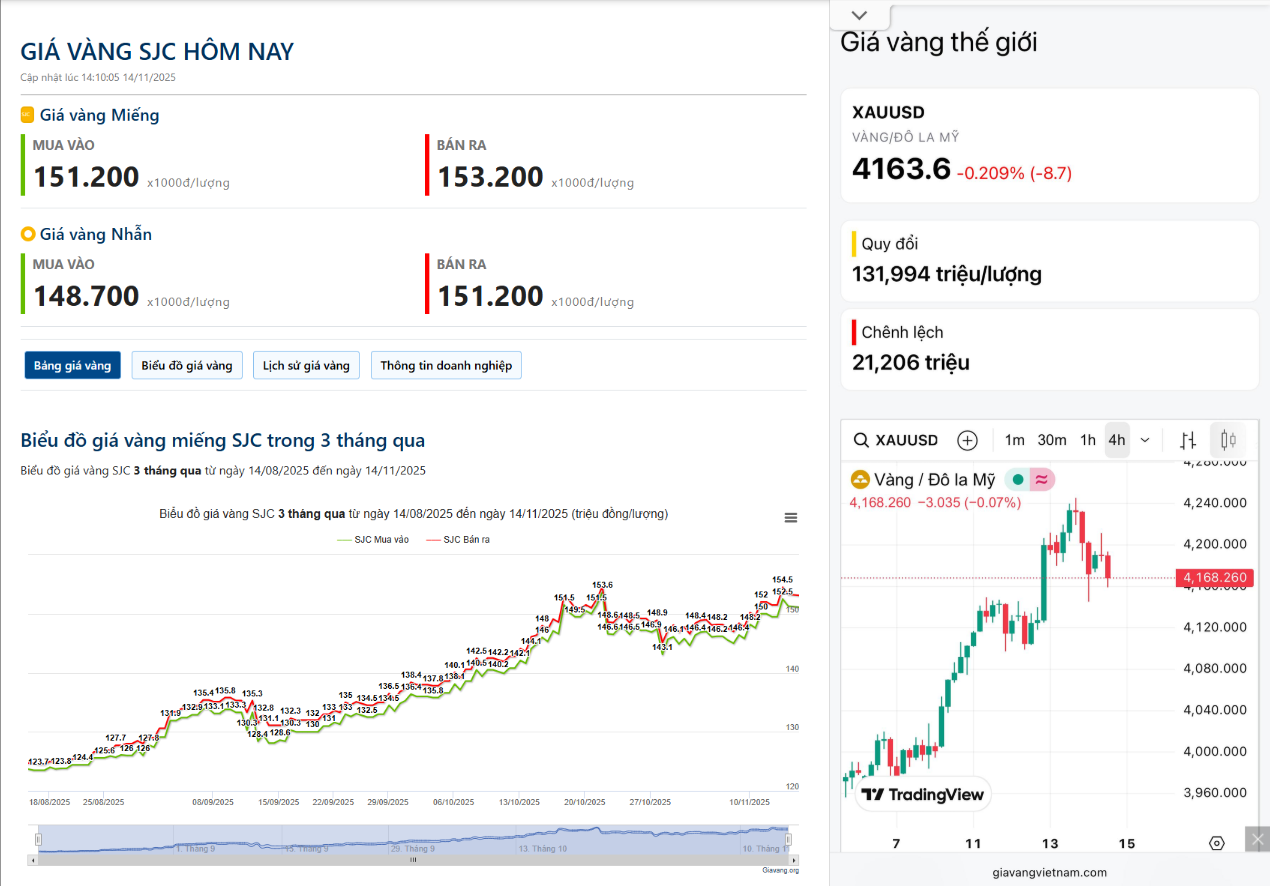 Vàng SJC: 153.2 triệu/lượng (giảm 1tr3 so với hôm qua).
