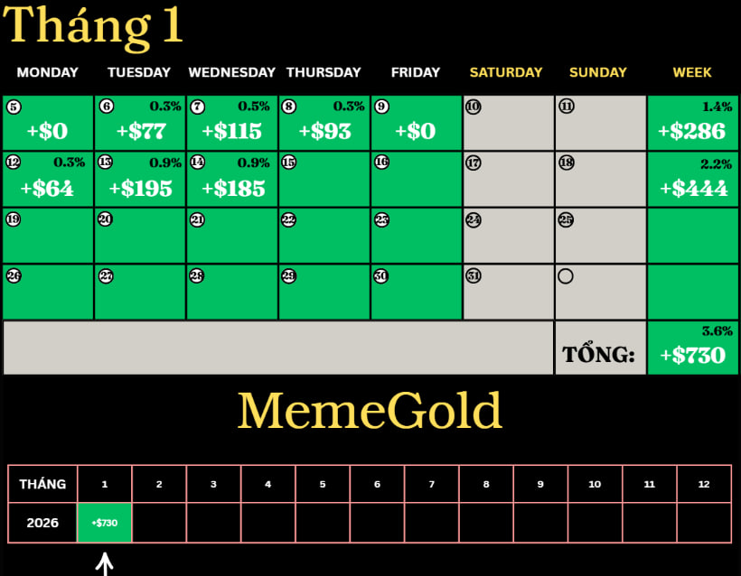 - Một tài khoản chấp nhận biến động cao hơn, tập trung khai thác các nhịp dao động trong kênh giá và các pha điều chỉnh kỹ thuật (MemeGold)