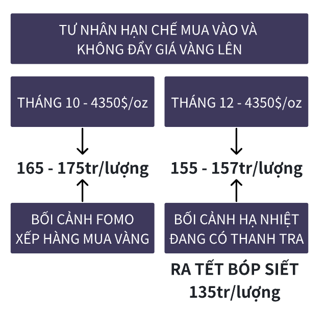 Nhưng sau Tết giá có thể giảm 15–20 triệu/lượng → họ không có lý do để đẩy giá mua lên mạnh