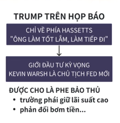 Về mặt vĩ mô, điểm đáng chú ý nhất đến từ phát biểu mới nhất của ông Trump. Trong buổi họp báo, ông công khai ủng hộ Kevin Hassett và ngầm xác nhận rằng Kevin Hassett sẽ không trở thành Chủ tịch Fed trong tương lai. Điều này khiến thị trường bắt đầu kỳ vọng người kế nhiệm Powell sẽ là Kevin Warsh – một nhân vật theo trường phái bảo thủ, không ủng hộ hạ lãi suất và cũng không thích bơm tiền.