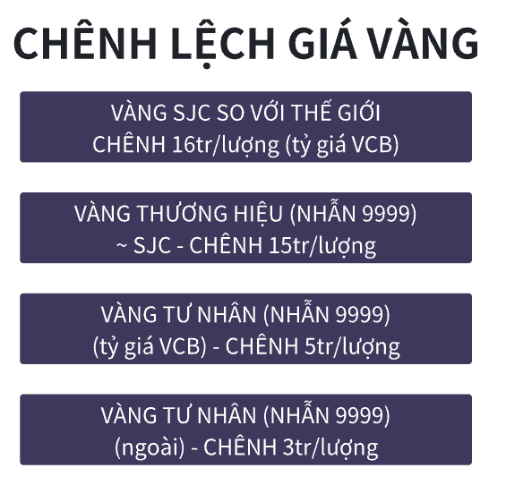 Hiện tại, vàng thương hiệu trong nước đang cao hơn giá vàng thế giới khoảng 15–16 triệu đồng/lượng (quy đổi theo tỷ giá ngân hàng). Trong khi đó: