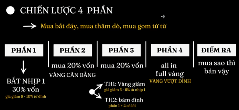 Nếu nhìn ngắn hạn theo giá, bạn rất dễ bán sai thời điểm. Vì vậy, cần quay lại đúng phương pháp gốc: chiến lược 4 phần.