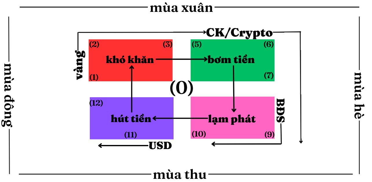 Nhìn lại bảng chu kỳ Prohack 1 lần nữa. Chúng ta đang ở giữa mùa xuân, sắp tết rồi. Suy thoái và khủng hoảng chính là cơ hội, nó khởi động 1 siêu chu kỳ mới: Vàng sẽ chạy nước rút (tăng nhanh, tăng mạnh), sau đó dòng tiền sẽ tìm đến những lớp tài sản đầu cơ như chứng khoán hay crypto và cuối cùng là bất động sản.