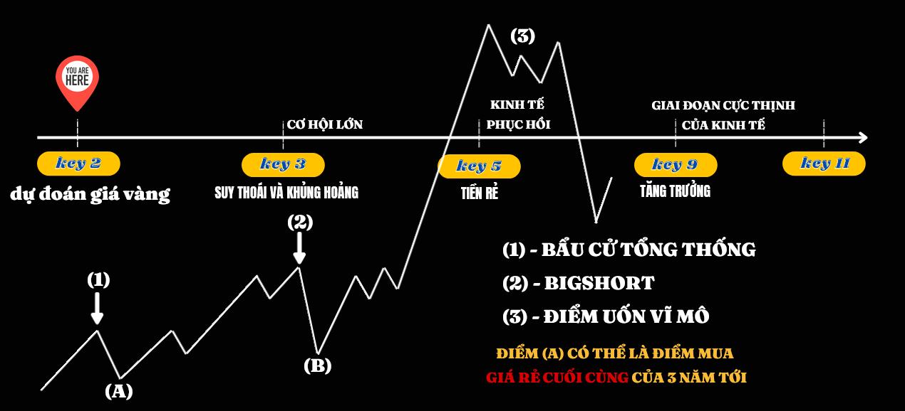 Đây là tấm bản đồ Kỳ đã vẽ cho giá vàng trong 3 năm tới. Điểm (A) tạm gọi là điểm mua đẹp sau bầu cử.