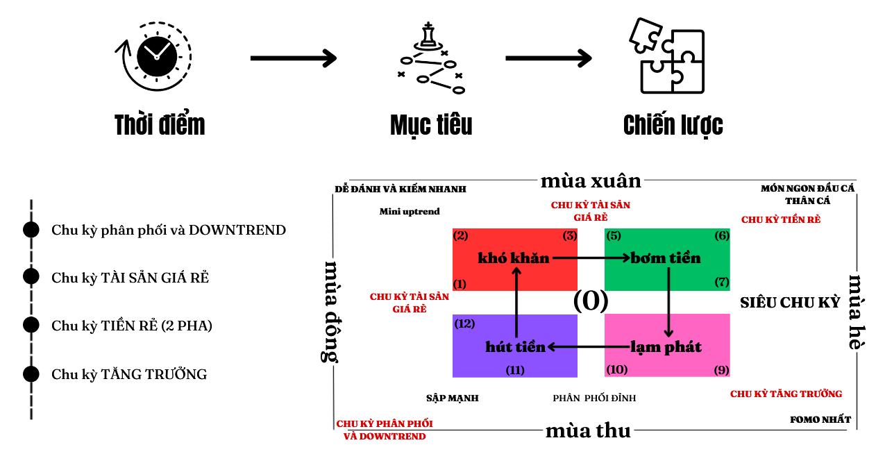 Đây là chu kỳ Xuân, Hạ, Thu, Đông của nền kinh tế kèm 12 keyword chỉ báo đơn giản để chúng ta xác định được mình đang ở đâu trong chu kỳ. Cùng với đó là thời của từng lớp tài sản trong chu kỳ kinh tế này.